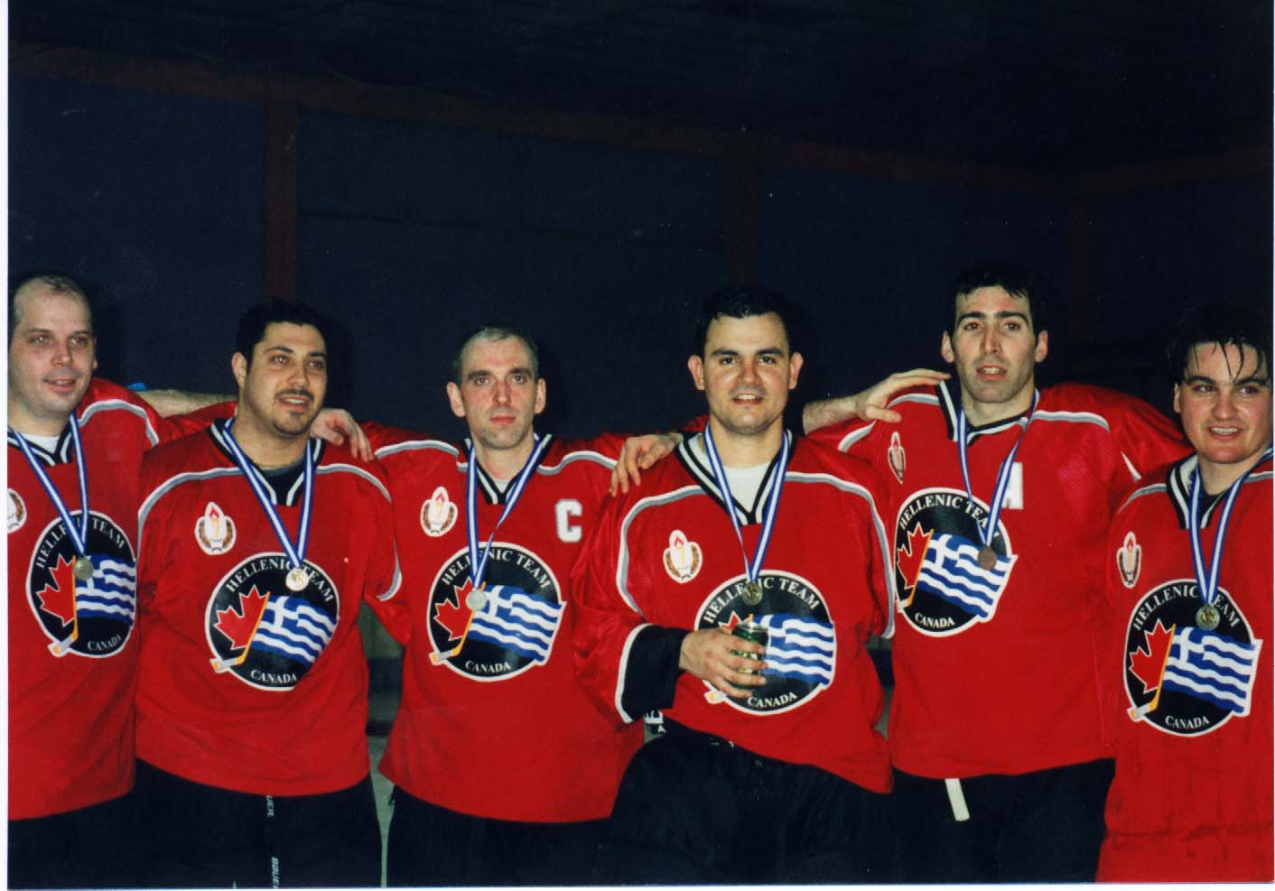 Proud of their silver medal, Hellenic Team Canada's Defence corps pose for pictures. Left to right: Spero Papoulias, Tom Zouzoulas, Jim Sourges, Bill Syrros, Emmanuel Florakas, Jim Antonakos |