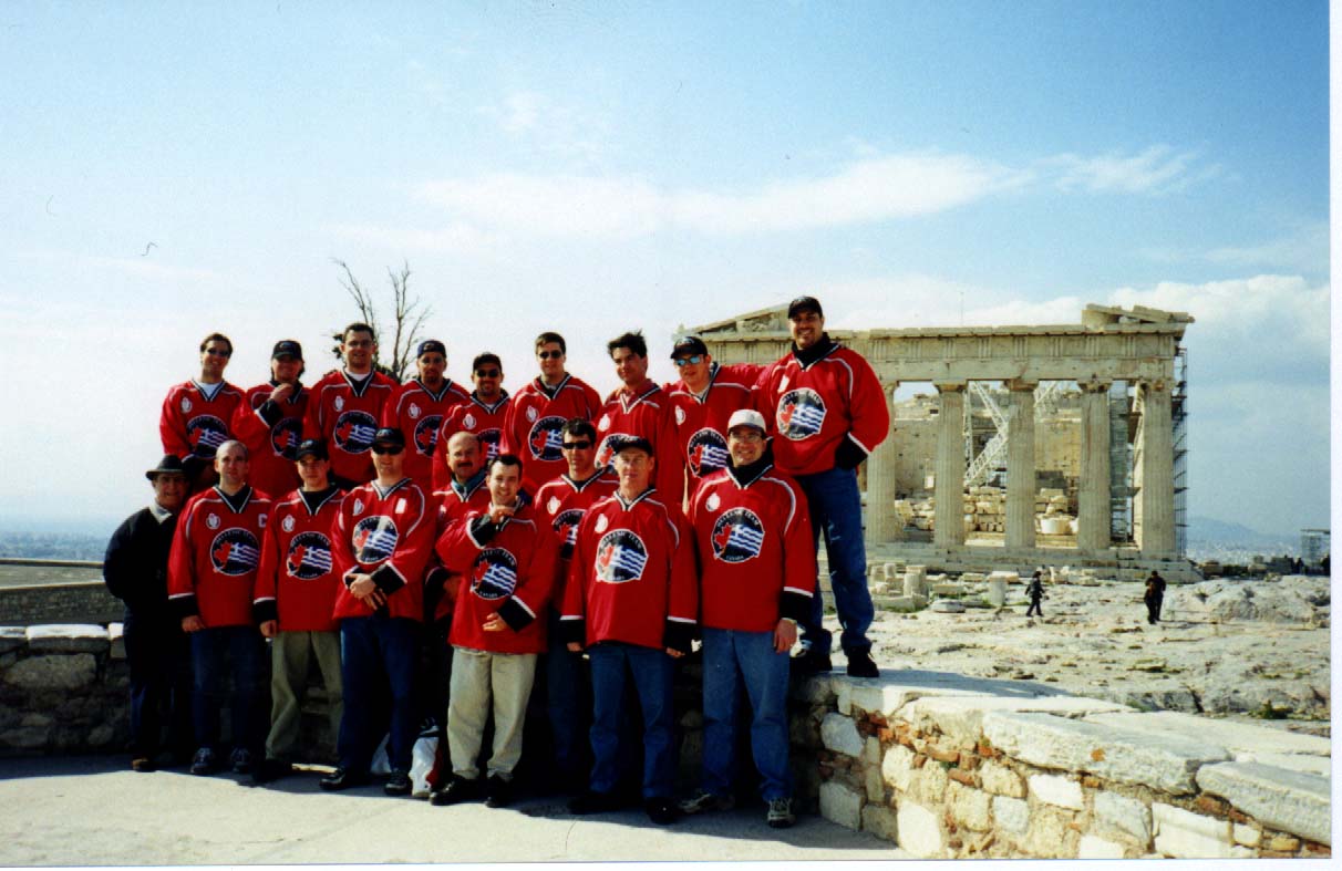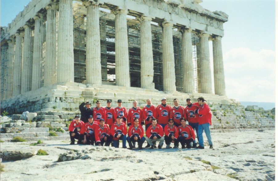 Hung over, the team made its way to the Acropolis. The tourists cleared out as soon as they got a whiff of our hockey sweaters. |